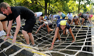 This is the Warrior Wall. It was kind of intimidating. I'm not used to climbing a wall while holding onto a rope. But the most unnerving thing was at the top, when you straddle the wall and climb down the other side.